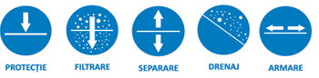 Stabilizare sol, construcția de căi ferate, sisteme de drenaj, structuri de pământ armat, lucrări hidrotehnice, protecția geomembranei.